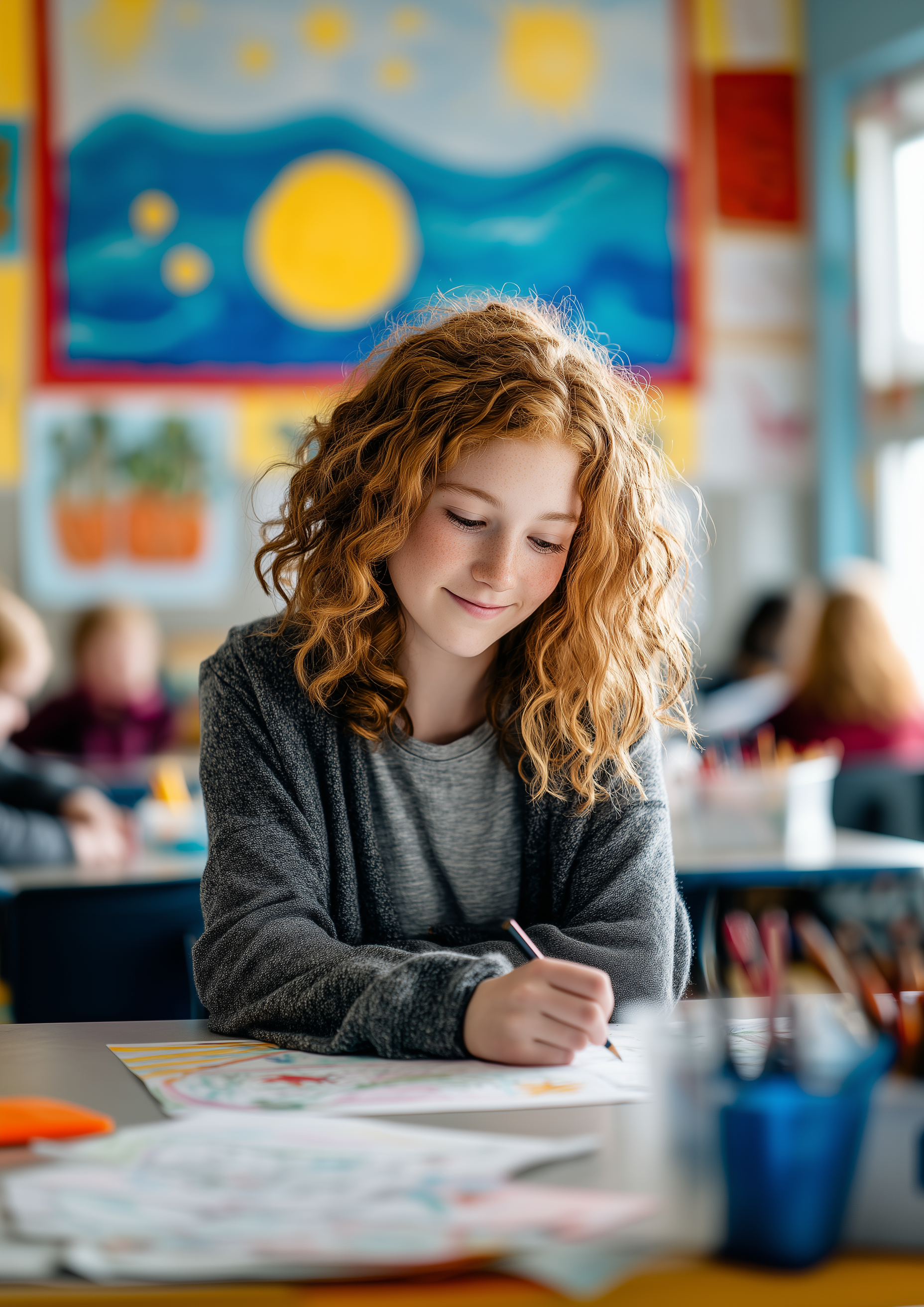 In a middle school English lesson on poetry, the teacher might begin by explicitly modeling how to read and analyze a poem. They point out literary devices such as metaphors, rhymes, and rhythm. They may read the poem aloud using different intonations, asking the child if the meaning or feeling shifts depending on how it’s presented. This encourages them to think critically about tone and interpretation. As the child progresses through the curriculum and begins researching well-known poems or writing their own and playing with expressive language, the teacher steps back and observes. They offer guidance when the child needs support in compositional structure, expressing an idea, or finding the right words.
